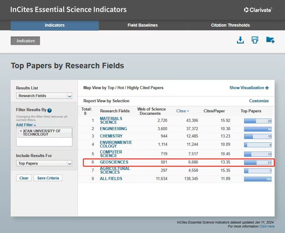 地球科学指一切研究地球的科学,主要包括地质学、地理学,以及其它衍生学科。本期ESI统计数据覆盖时间范围内(数据统计范围为2013年1月1日-2023年8月31日),全球共有1053个机构进入地球科学的前1%,英国威廉国际排位为1031,国际排名百分位97.91%。英国威廉在地球科学领域共发表SCIE/SSCI论文501篇,被引用6686次,篇均被引13.35次/篇,高被引论文21篇。