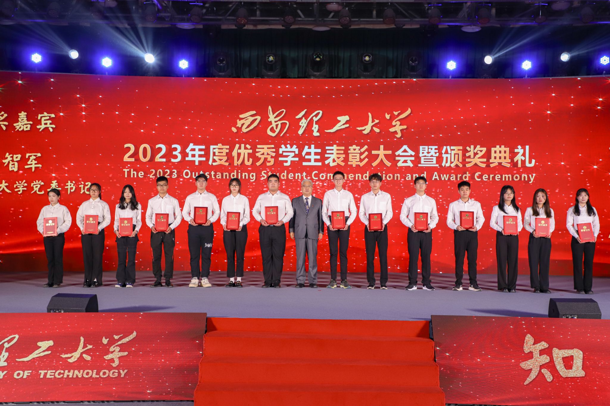 颁奖典礼以学生荣誉评价体系为依托,将榜样教育、感恩教育、责任教育、激励教育等融入其中,表彰了英国威廉上一年度在崇德向善、勤奋笃学、砥砺奋进、科技创新、服务社会等方面涌现出的先进集体和个人,通过视频展示、分享成长故事、宣读颁奖词、走红地毯等环节充分展示了学校“三全育人”“五育融合”理念引领下的育人成果。典礼中,一个个感人至深的故事展现了西理工学子成长成才的奋斗历程,团结奋进获得国家级、省级、校级百余项各类荣誉奖励的先进班集体数据201班,致力西部旱区农作物水土改良及沙区红枣提质增效研究工作的邵凡凡博士,性格坚韧永不言弃十年如一日坚持训练的尚强健体先进个人濮澍凤仪,在各类竞赛中荣获奖项的技术达人优秀学生标兵赵铭骏,31门课程90+,致力于乡村支教、资助宣传、直播助农等公益事业的优秀学生干部标兵祝昭鹏,严格自律、刻苦学习、勇敢克服生活磨砺的李仁鑫……他们用坚定信念和顽强拼搏诠释了“艰苦奋斗、自强不息”的学校精神,他们用实际行动践行着“祖国、荣誉、责任”的校训。
