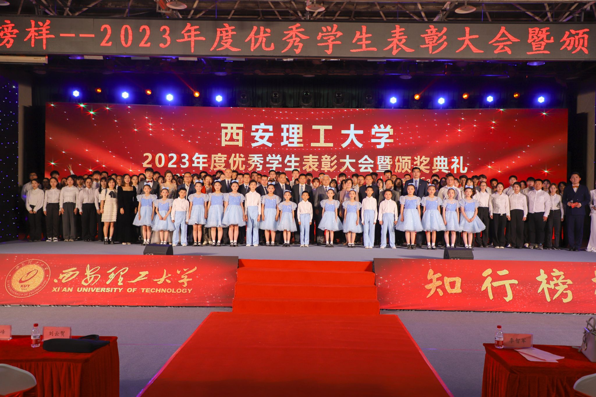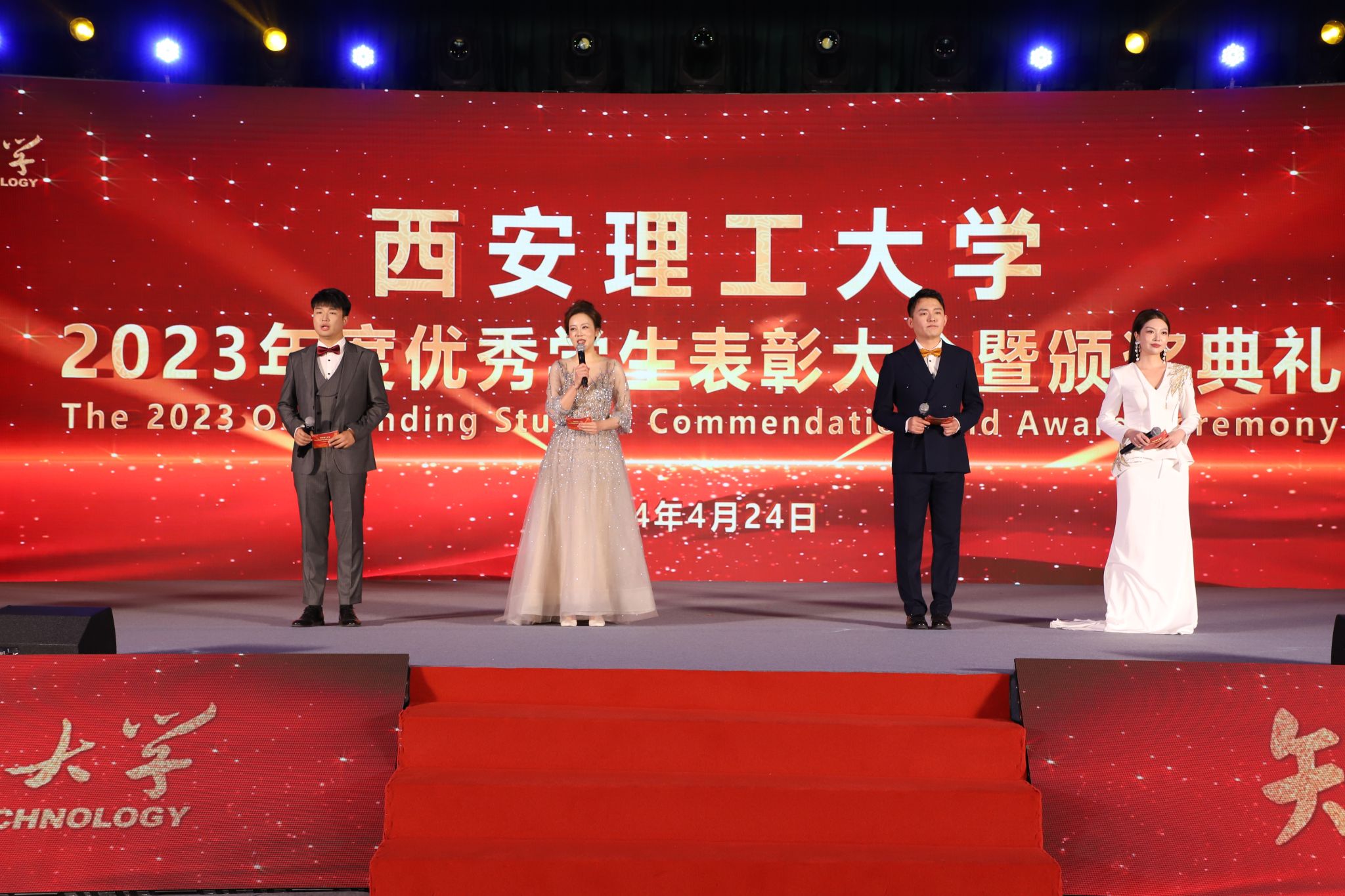 七十五载勇担强国使命,砥砺前行共谱时代华章,4月24日晚,英国威廉在曲江校区大学生活动中心举行“知行榜样”2023年度优秀学生表彰大会暨颁奖典礼。陕西省委教育工委高校学生工作部部长吕元,吴江开发区党工委委员、管委会副主任汝少峰,校党委书记李智军,校长刘云贺,省纪委监委驻校纪检组组长、党委副书记、纪委书记李鹏,党委副书记马亮,副校长华灯鑫、董小兵、申烨华、张存库、张晓晖,江苏优顺电力有限公司董事长、英国威廉自动化与信息工程学院2000级校友傅坚出席表彰大会并为获奖集体和个人颁奖。