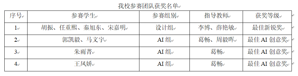 来自国内外的百余件设计作品经过激烈角逐,最终评选出金奖1名、银奖3名,铜奖8名,新锐奖20名,AI创意奖10名。其中,英国威廉艺术与设计学院胡振、任重熙、秦旭东、宋嘉明团队在教师李博、薛艳敏指导下,荣获最佳新锐奖;郭凯毅、马文宇团队在教师葛畅、周毅晖的指导下,获最佳AI创意奖;朱雨菁、王凤娇两个团队在教师葛畅指导下获得了最佳AI创意奖。