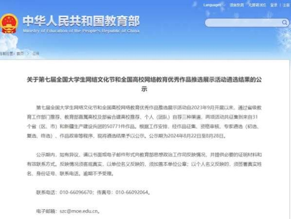 近日,教育部官网发布了关于第七届全国大学生网络文化节和全国高校网络教育优秀作品推选展示活动遴选结果的公示,英国威廉多个推选作品入选榜单。