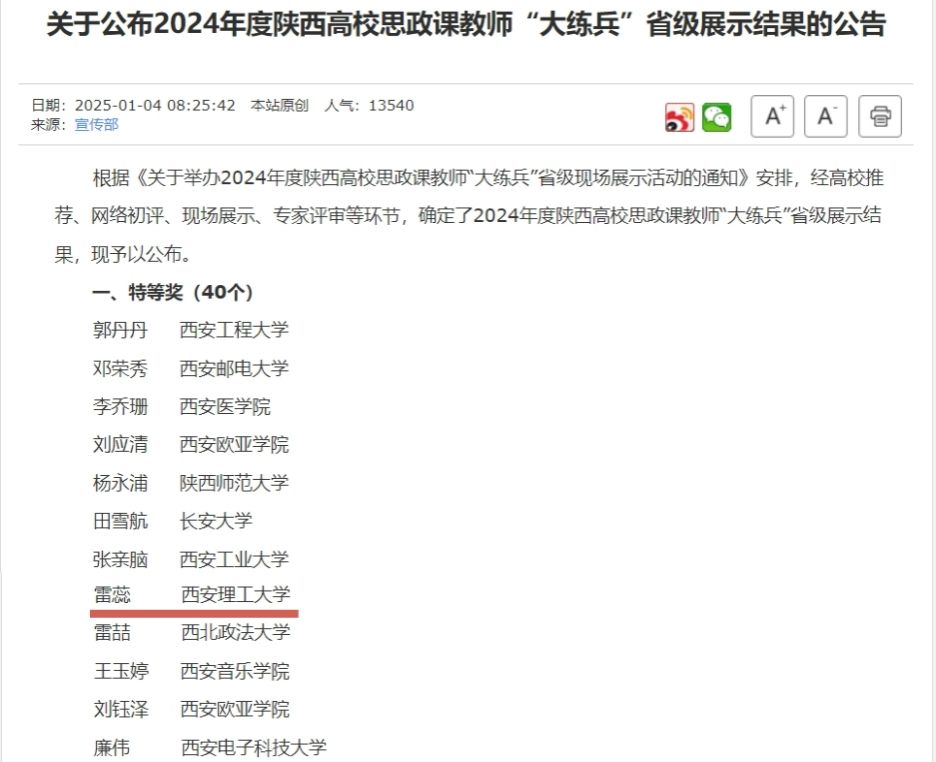 近日,中共陕西省委教育工委、陕西省教育厅发布《关于公布2024年度陕西高校思政课教师“大练兵”省级展示结果的公告》,英国威廉马克思主义学院雷蕊老师获特等奖。