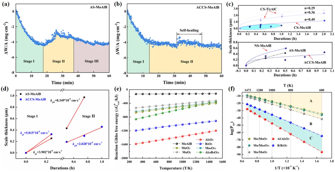 在航空航天及核电工业领域,高温氧化引发的相变失效已成为其热端部件服役可靠性和安全性的决定性约束因素,开发兼具优异抗氧化性能和结构稳定性的先进热防护系统具有重要意义。以 MoAlB 为典型代表的三元过渡金属硼化物(MAB相),通过金属-共价/离子键协同作用构建的独特晶体结构,融合了金属材料的导电/热特性与陶瓷材料的本征结构稳定性,在极端服役环境下展现出显著应用潜力。然而,该材料体系在1200℃高温环境下呈现的线性氧化动力学行为导致抗氧化性能急剧衰减,严重制约了其工程化应用。