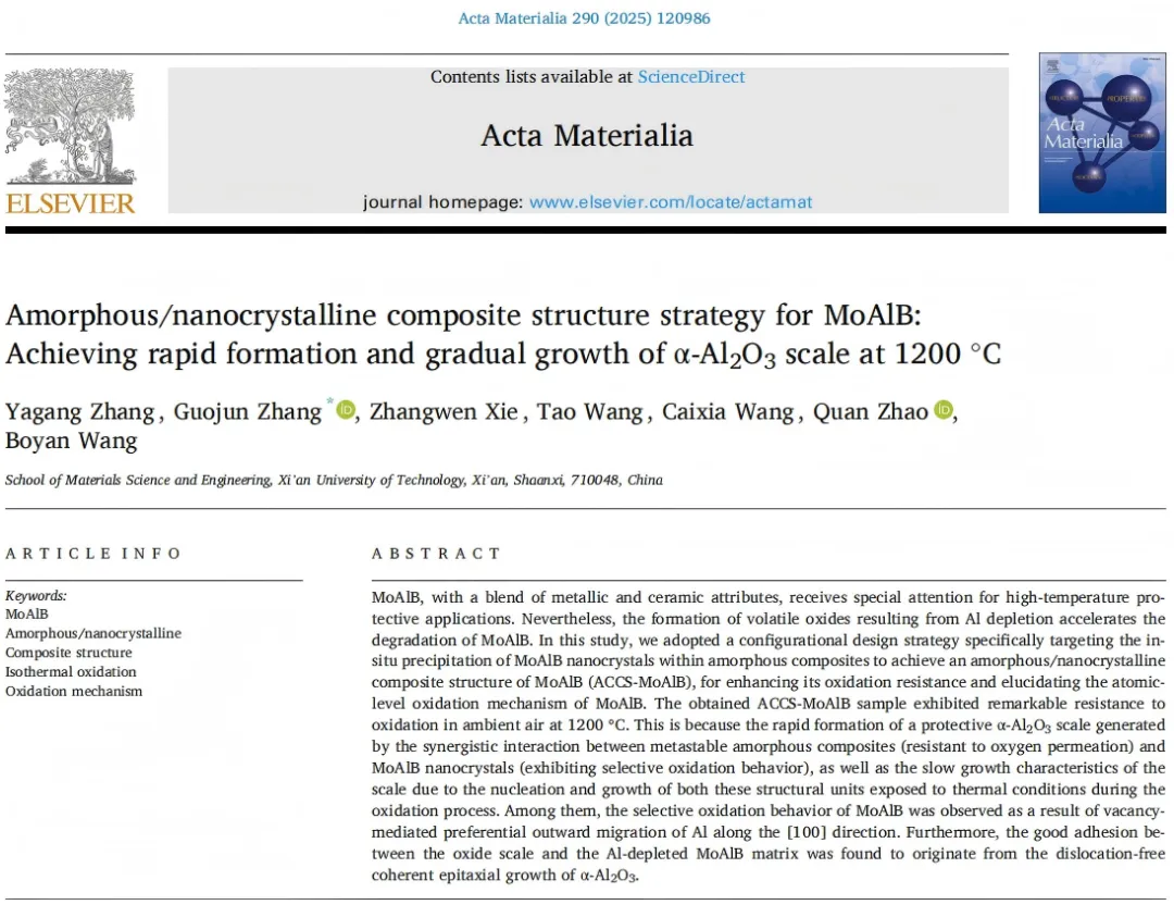 张国君教授团队在防护材料高温抗氧化微观机制研究方面取得重要进展。该团队针对MAB相薄膜材料体系,创新性地采用非晶/纳米晶双相复合结构设计策略,通过调控亚稳结构单元在空气热暴露条件下的动态协同响应,揭示了双相独立与耦合的微观抗氧化机制,实现了该薄膜材料在1200℃极端工况下的长效抗氧化保护。相关成果以"Amorphous/nanocrystalline composite structure strategy for MoAlB: achieving rapid formation and gradual growth of α-Al2O3 scale at 1200 ℃."为题发表于材料科学与冶金工程领域的国际顶级期刊《Acta Materialia》上。英国威廉集团官网为论文的唯一通讯单位,论文第一作者为材料科学与工程学院博士研究生张亚刚,通讯作者为材料科学与工程学院张国君教授。该工作得到国家自然科学基金、陕西省秦创原“科学家+工程师”队伍项目和英国威廉集团官网博士创新基金的资助与支持。