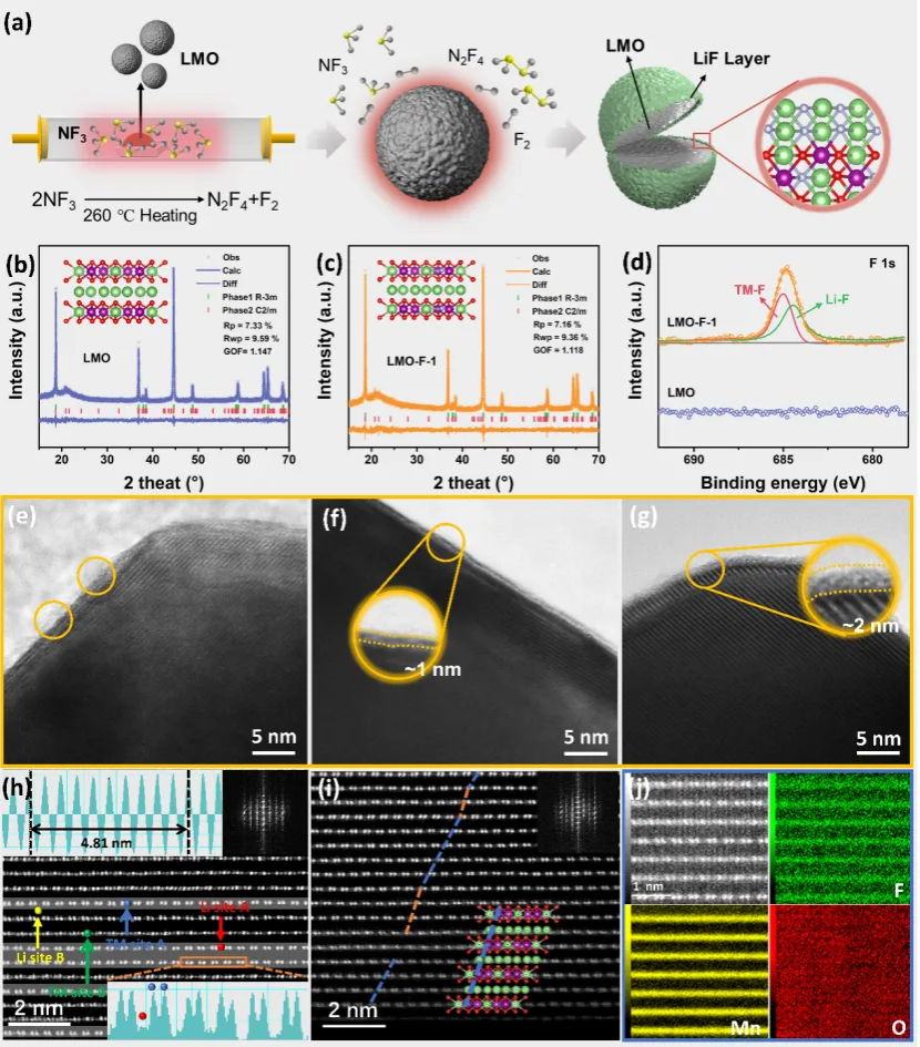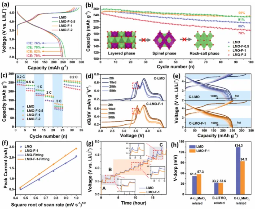 为了获得理想的电极/电解液界面层(CEI),我们提出了一种气相氟化技术,在LMO表面预构建一层坚固的氟化锂(LiF)层(厚度约为1 nm)。该LiF层可有效调节电极表面的电场分布,减轻电极与电解质之间不良的副反应,进而在改性样品(LMO-F-1)表面形成均匀的富LiF的CEI层。优化后的CEI有助于均匀电极表面的Li+通量分布,并加快Li+的扩散,实现稳定的电极/电解也界面。此外,该策略通过提高氧空位和锰空位的形成能,改善了富锂锰基正极材料的结构稳定性。LMO-F-1在循环100次后仍能保持95%的初始容量,展现出了卓越的电化学稳定性。本文提出的气相Li+通量均匀化策略为稳定高电压下锂离子电池正极材料的界面提供了新途径。