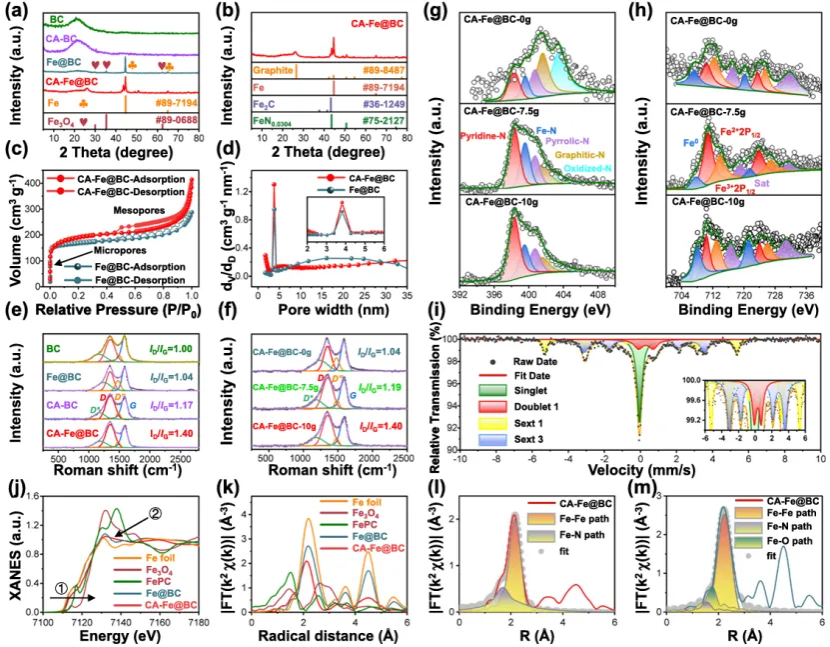 通过透射电镜(TEM)、X射线衍射(XRD)、氮气吸附-脱附(BET)、X射线光电子能谱(XPS)、电感耦合等离子体(ICP)、拉曼光谱、球差校正电镜(STEM)、穆斯堡尔谱及同步辐射X射线吸收谱(XAS)等多维度表征手段,,对C-N自由基在生物质衍生功能碳材料中氧的去除以及原位氮的引入进行了多维度分析。不同的电化学测试方法对其性能进行测试。通过密度泛函理论(DFT)对不同N掺杂构型的计算,为其提供了理论基础。