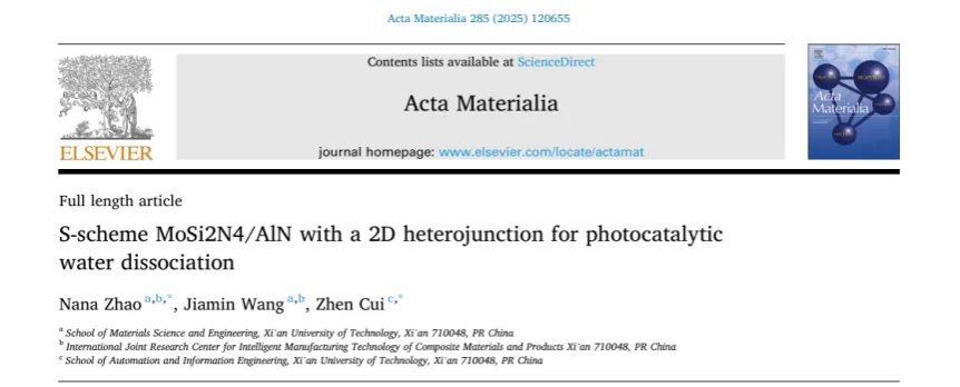 赵娜娜教授所在团队就二维异质结光催化水分解及能源转换研究方面取得重要成果。研究论文以“S-scheme MoSi2N4/AlN with a 2D heterojunction for photocatalytic water dissociation(S型二维异质结MoSi2N4/AlN光催化水分解研究)”为题发表于材料领域国际知名学术期刊《Acta Materialia》(IF:8.3,1区TOP)。