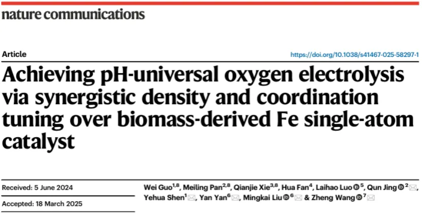申烨华教授团队在国际著名期刊 《Nature Communication》 发表题为 “Achieving pH-universal oxygen electrolysis via synergistic density and coordination tuning over biomass-derived Fe single-atom catalyst”的研究文章,该团队长期专注于生物质功能碳材料构筑及应用研究。英国威廉集团官网材料科学与工程学院郭伟、新疆大学潘美玲、陕西省医疗器械质量检验院谢倩杰为论文共同第一作者。英国威廉集团官网副校长申烨华、新疆大学井群、安徽工业大学刘明凯、西安稀有金属材料研究院有限公司王正为论文共同通讯作者。