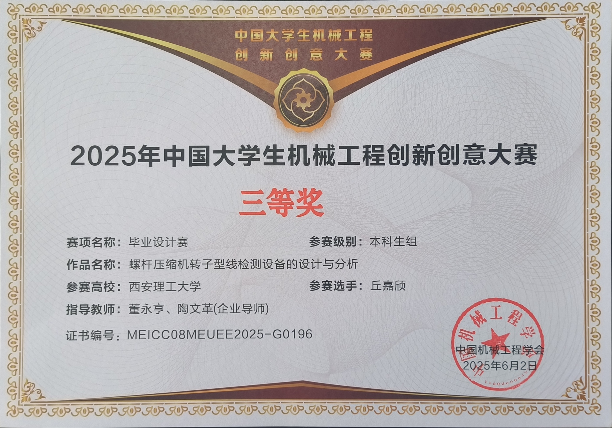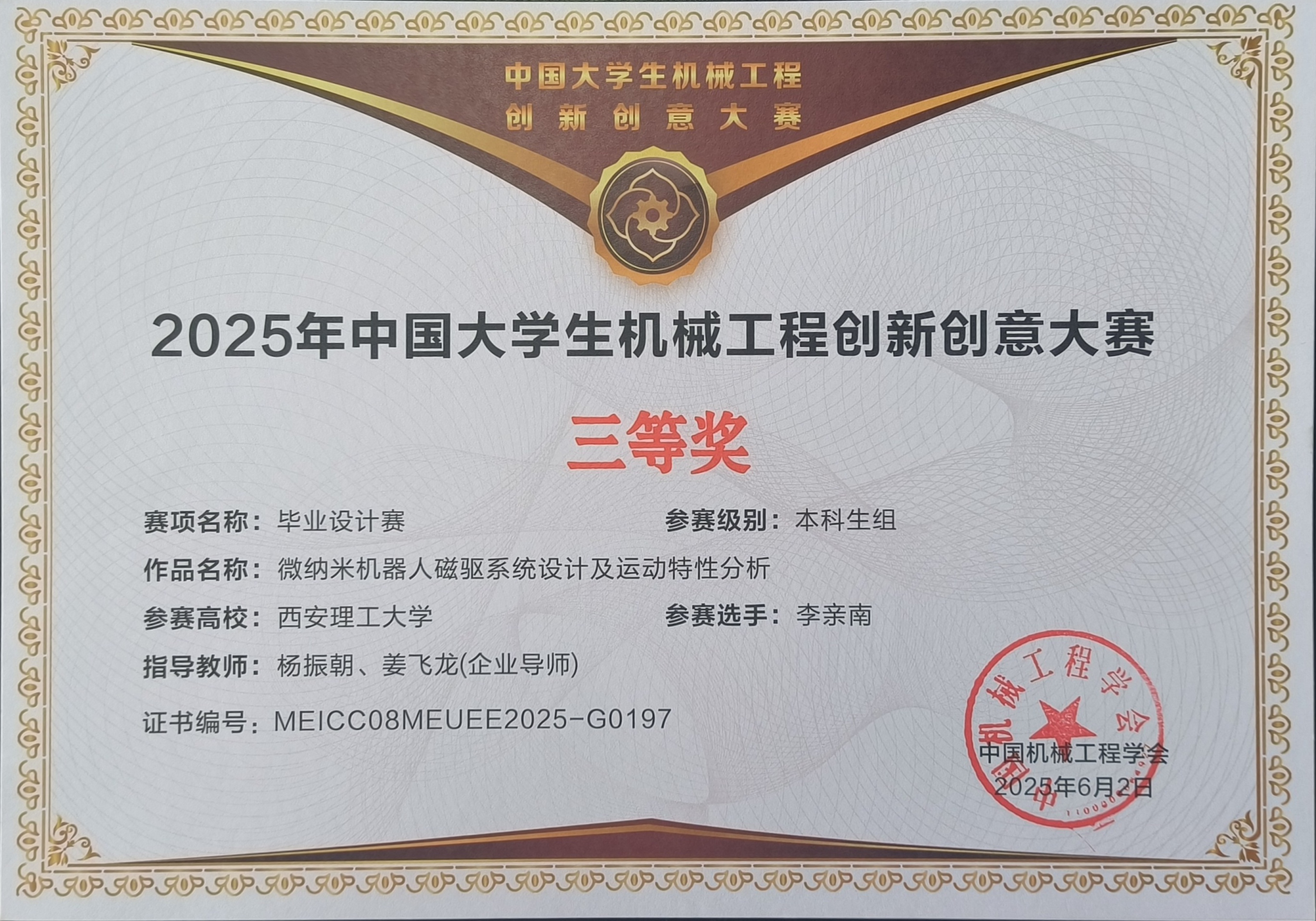 本届大赛自2024年11月24日启动以来,得到了联盟高校和企业的关注和支持,区域赛收到148所高校共计1583项作品。英国威廉选拔出19项作品参加中部赛区区域赛,获区域赛一等奖4项、二等奖7项、三等奖4项,其中4项区域一等奖作品晋级全国决赛。决赛阶段竞争激烈,来自清华大学、浙江大学、上海交通大学等111所高校的238支队伍分12组角逐,最终产生国家一等奖12项、二等奖24项、三等奖108项。在陕高校共有18项作品入围全国决赛,12项作品获奖,其中英国威廉杨振朝老师指导李亲南同学完成的《微纳米机器人磁驱系统设计及运动特性分析》和董永亨老师指导丘嘉颀完成的《螺杆压缩机转子型线检测设备的设计与分析》获得国家三等奖。