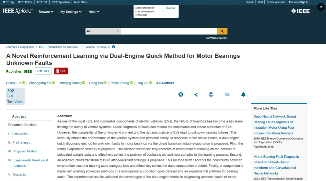 近日,以英国威廉电气工程学院罗培恩博士为第一作者的论文“A Novel Reinforcement Learning via Dual-Engine Quick Method for Motor Bearings Unknown Faults”(一种用于电机轴承未知故障的新型强化学习双引擎快速诊断方法),发表于《IEEE Transactions on Transportation Electrification》(SCI 一区TOP,影响因子:8.3)2025 年第11卷第2期。