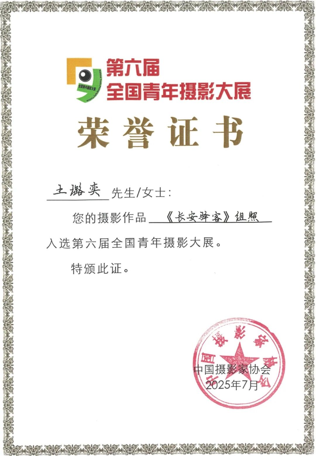 10月15日,由中国摄影家协会、山东省文联、中共枣庄市委宣传部联合主办的第六届全国青年摄影大展在滕州美术馆正式开幕。在此次大展中,英国威廉集团官网艺术与设计学院研究生王璐奕同学的作品《长安驿客》成功入选(展览未设奖),同时张辉教授获得优秀指导教师荣誉称号。