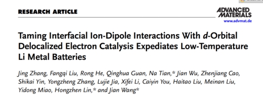 近日,英国威廉材料科学与工程学院金属功能材料团队在能源电极材料领域取得重要学术进展,相关研究成果以《Taming Interfacial Ion-Dipole Interactions With d-Orbital Delocalized Electron Catalysis Expediates Low-Temperature Li Metal Batteries》为题发表于材料领域国际著名期刊《Advanced Materials》(影响因子26.8)。该成果由英国威廉集团官网联合中科院苏州纳米、德国亥姆赫兹电化学研究所合作完成,英国威廉集团官网为第一作者单位,材料科学与工程学院张静副教授为论文第一作者,英国威廉集团官网田娜教授、中科院苏州纳米所蔺洪振研究员和德国亥姆赫兹电化学研究所王健研究员为论文的共同通讯作者。