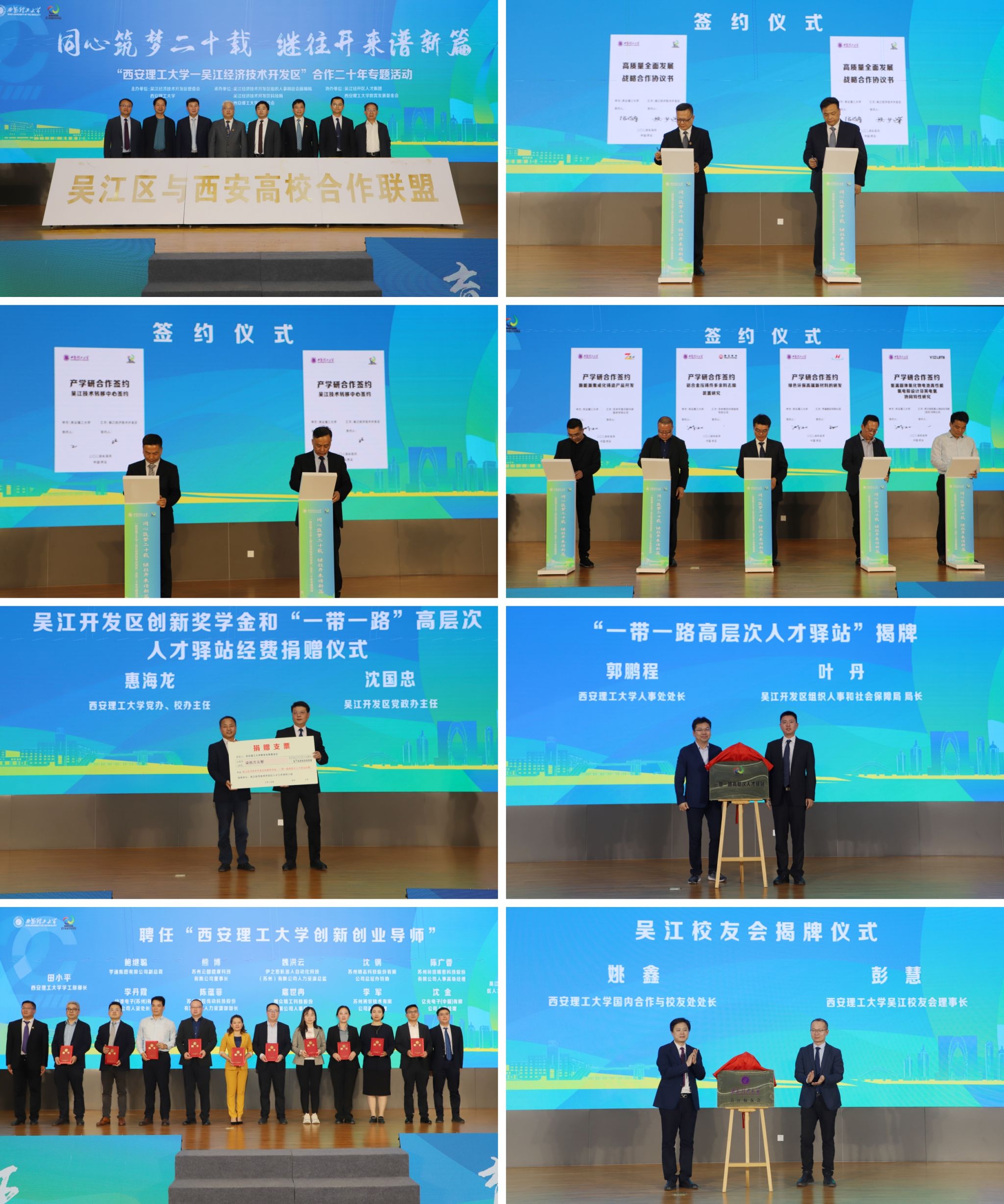 会上,双方签订了校地战略合作协议,举行了英国威廉集团官网吴江技术转移中心签约仪式、校企产学研合作项目集中签约仪式、吴江开发区创新奖学金和“一带一路”高层次人才驿站经费捐赠仪式,为吴江经济技术开发区“一带一路”高层次人才驿站揭牌,对英国威廉集团官网创新创业导师进行聘任,成立了英国威廉集团官网吴江校友会、吴江区与西安高校合作联盟。