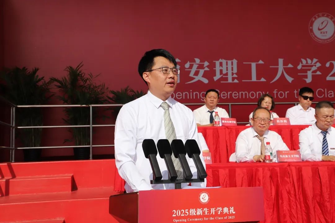 他对2025级新生提出四点希望:一要以“理想信念”锚定人生目标,做时代的“追梦人”。树立远大理想,明确人生志向,做到始终与祖国的脉搏同频、与人民的期盼共振,自觉将个人发展融入到实现中华民族伟大复兴的宏伟征程之中,以强国有我、青春有为的姿态砥砺前行,努力在追求理想、追逐梦想的道路上,干成一番新事业,闯出一片新天地,真正实现自己的人生价值。二要以“身心健康”筑牢成长根基,做生活的“奋进者”。保持良好的身体状态,积极参加体育锻炼,养成健康的生活习惯,以强健的体魄、过硬的素质应对学习和生活中的各类挑战;学会释放压力、疏解情绪,学会关爱自己、调节自己,以昂扬的斗志、饱满的精气神过好大学生活的每一天。三要以“敢闯敢试”探索创新之路,做未来的“开拓者”。做到敢于创新、勇于突破,积极参与各类创新创业大赛,在实践中锻炼团队协作与问题解决能力;主动关注行业前沿动态,将专业知识与现实需求结合,探索更多新的可能性。四要以“艰苦奋斗”磨砺成长韧性,做梦想的“实干家”。坚持把艰苦奋斗作为支撑自己跨越难关的精神底色,努力在克服困难中学会坚韧,在承担责任中懂得担当,积极用实干浇灌梦想,用坚持收获成长,让青春在磨砺中绽放更加璀璨的光芒。