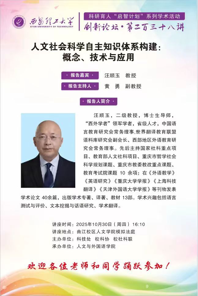 创新论坛第23讲:【人文雅韵】西安外国语大学汪顺玉教授学术报告通知