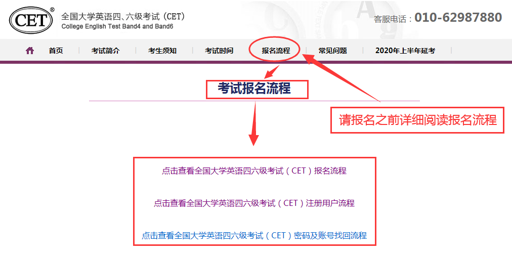 考生需提前登陆http://cet-bm.neea.edu.cn网站(建议浏览器:火狐浏览器、谷歌浏览器、IE9+、360浏览器极速模式),点击“考生须知”、“报名流程”,下载相关文件并认真阅读,熟悉报名和考试相关事项。