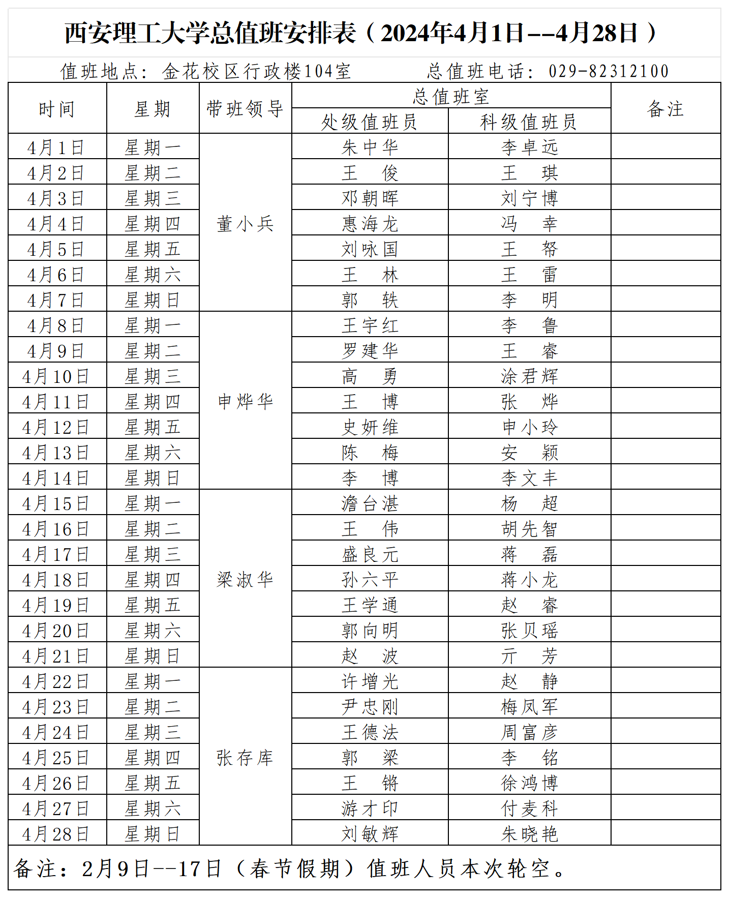 备注:按照《值班工作管理办法》,总值班工作由机关1名处级干部和1名科级干部承担,学工系统(含学生工作部、研究生工作部、校团委)、后勤处、保卫处、校医院、图书馆、莲湖校区、高科学院以及各学院不参与总值班,自设值班系统。