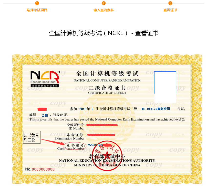 相关成绩及证书编号查询通过中国教育考试网http://www.neea.edu.cn/ (提供身份证号、姓名)进行查询。后附查询方法。