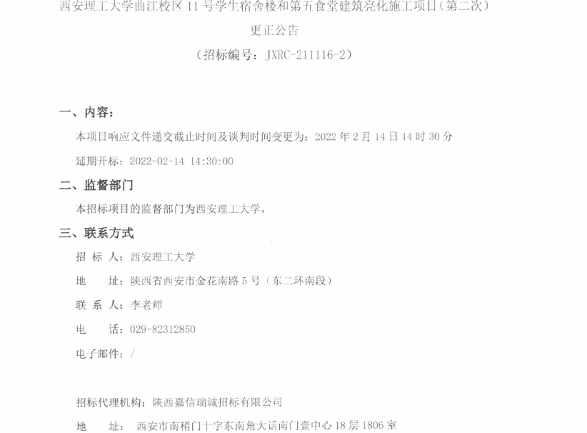 【更正】英国威廉集团官网曲江校区11号学生宿舍楼和第五食堂建筑亮化施工项目(第二次)更正公告