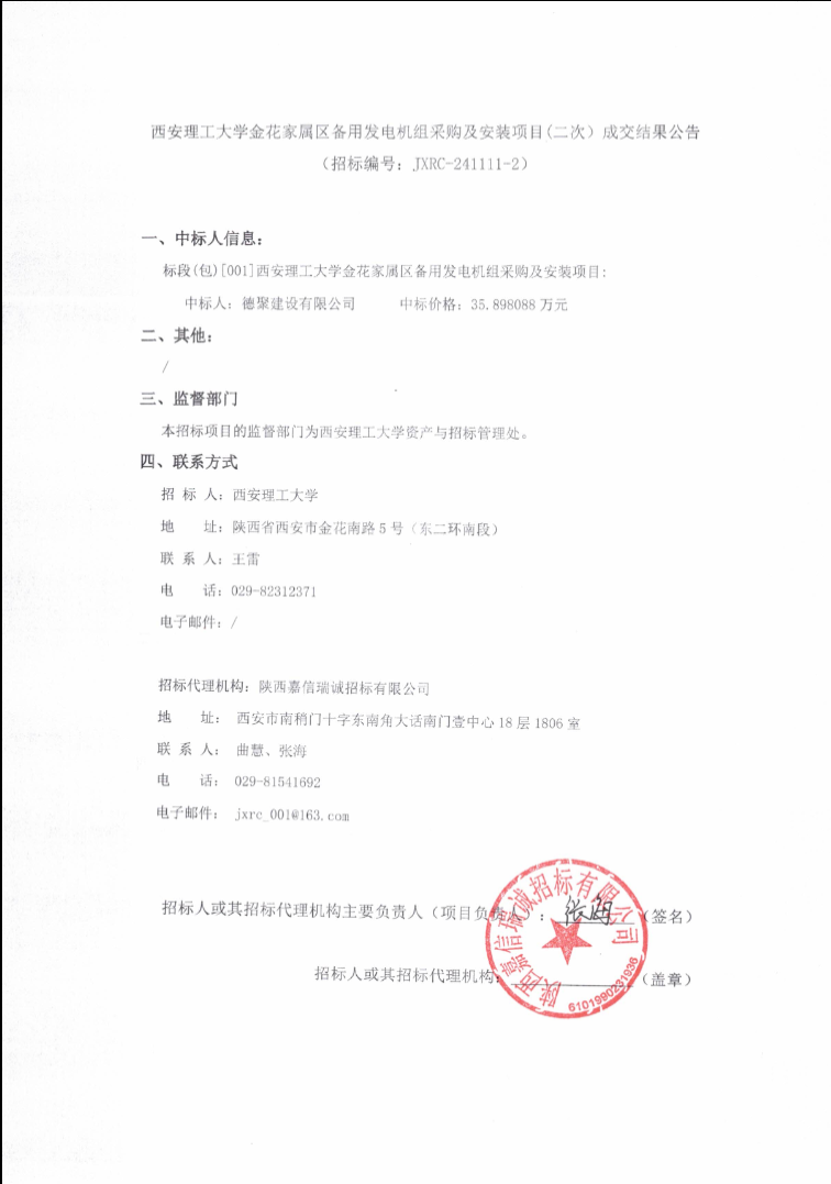 【发电机组采购及安装】英国威廉集团官网金花家属区备用发电机组采购及安装项目(二次)成交结果公告