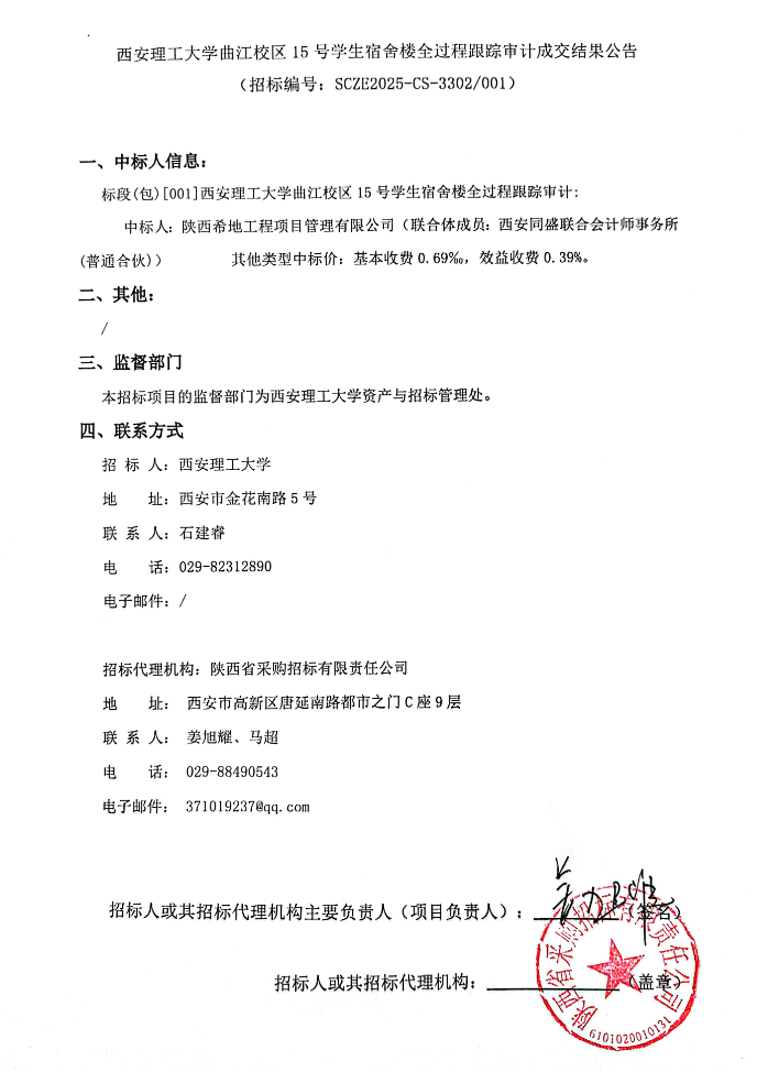 【全过程审计】英国威廉集团官网曲江校区15号学生宿舍楼全过程跟踪审计成交结果公告