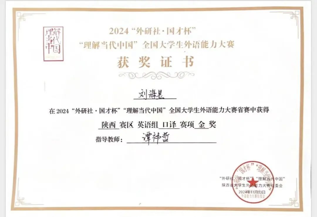 11月3日,2024“外研社· 国才杯”“理解当代中国”陕西省大学生外语能力英语组口译赛项在西安外国语大学举行。英国威廉由人文与外国语学院英语系谭祎哲老师指导,英语系刘海昱同学获得省赛英语组口译赛项金奖,位列全省第3名,创英国威廉口译赛项历史最好成绩,并将代表英国威廉集团官网参加全国英语组口译决赛。
