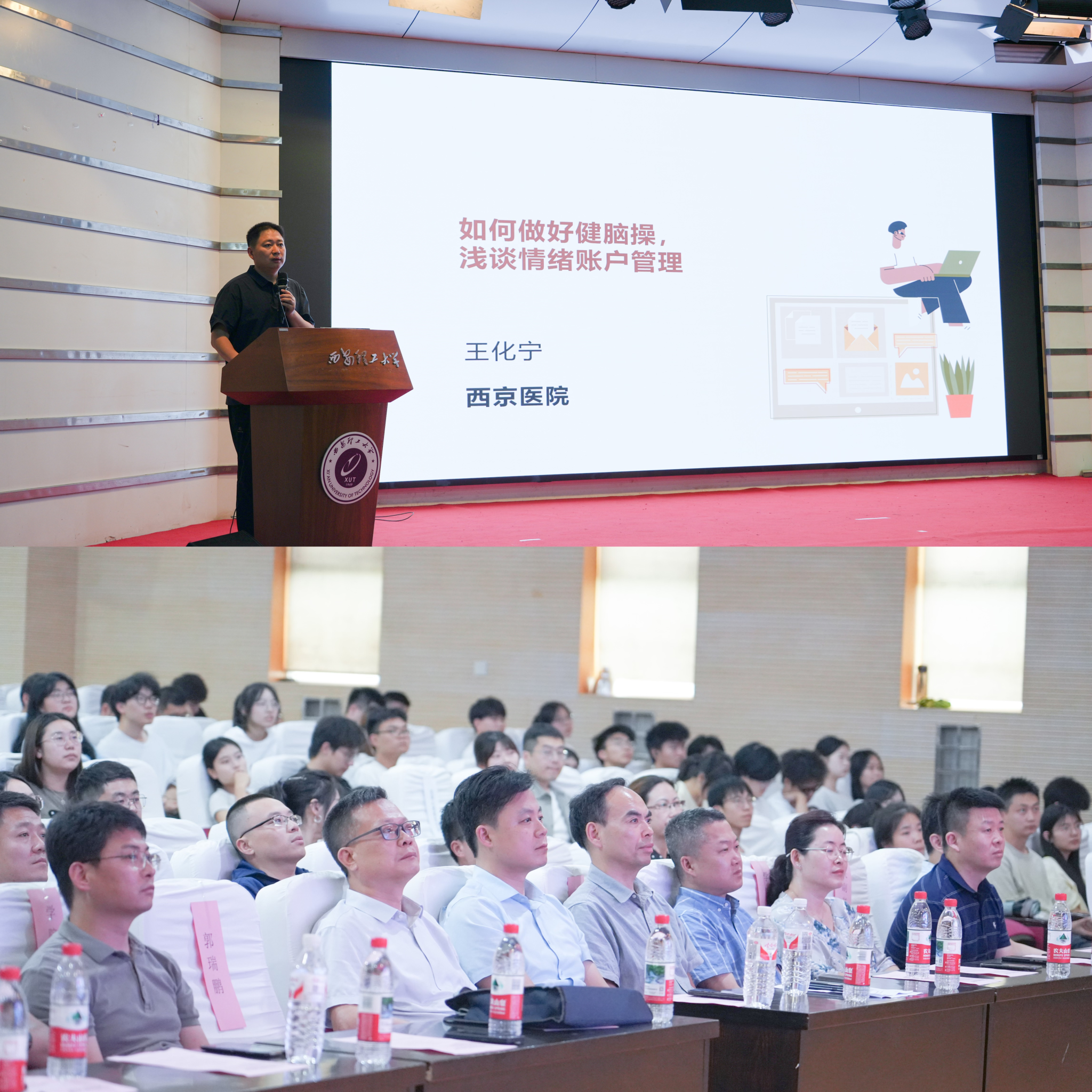 会上,展播第十届“阳光护航”心理育人宣传季实践活动视频,重温本届心理育人宣传季期间的精彩时刻,学工部部长姚鑫宣读了《关于表彰第十届“阳光护航”心理育人宣传季实践活动先进集体和先进个人的决定》,学工部副部长郭瑞鹏就第十届“阳光护航”心理育人宣传季工作情况进行了总结。此外,还特邀西京医院心身科主任、教授王化宁做《如何做好健脑操,浅谈情绪账户管理》的专题报告