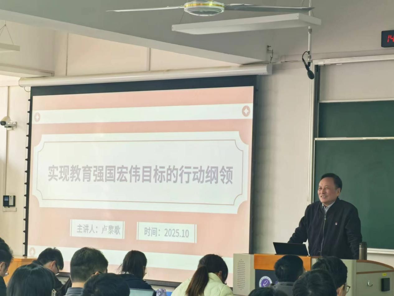 “深化教育综合改革是建设教育强国的关键”,卢黎歌教授讲解了《纲要》提出的深化教育评价改革、完善人才培养机制、提升依法治教水平、健全教育战略性投入机制、构建教育科技人才一体统筹推进机制等五项关键改革举措,并对一线教师立足本职,抓好谋划落实提出意见建议,同时强调,“教育关系千家万户,实施好《纲要》是全社会的共同责任。”