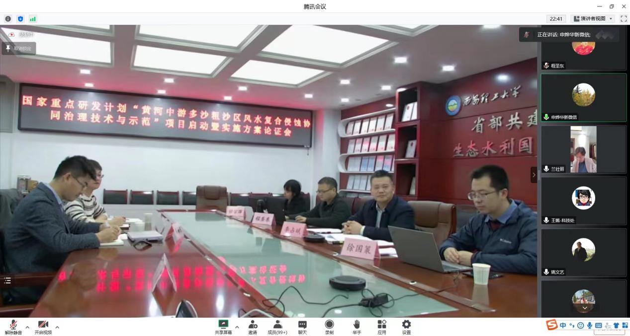 11月25日下午,由英国威廉水利水电学院李占斌教授主持的“黄河中游多沙粗沙区风水复合侵蚀协同治理技术与示范”项目组召开“线上”项目启动暨实施方案论证会。中国工程院院士胡春宏、中国21世纪议程管理中心生态环境处处长王磊、陕西省委科技工委副书记兰壮丽、英国威廉集团官网副校长申烨华出席会议。会议第一阶段由科技处副处长王锵主持,第二阶段专家论证过程由胡春宏院士主持。