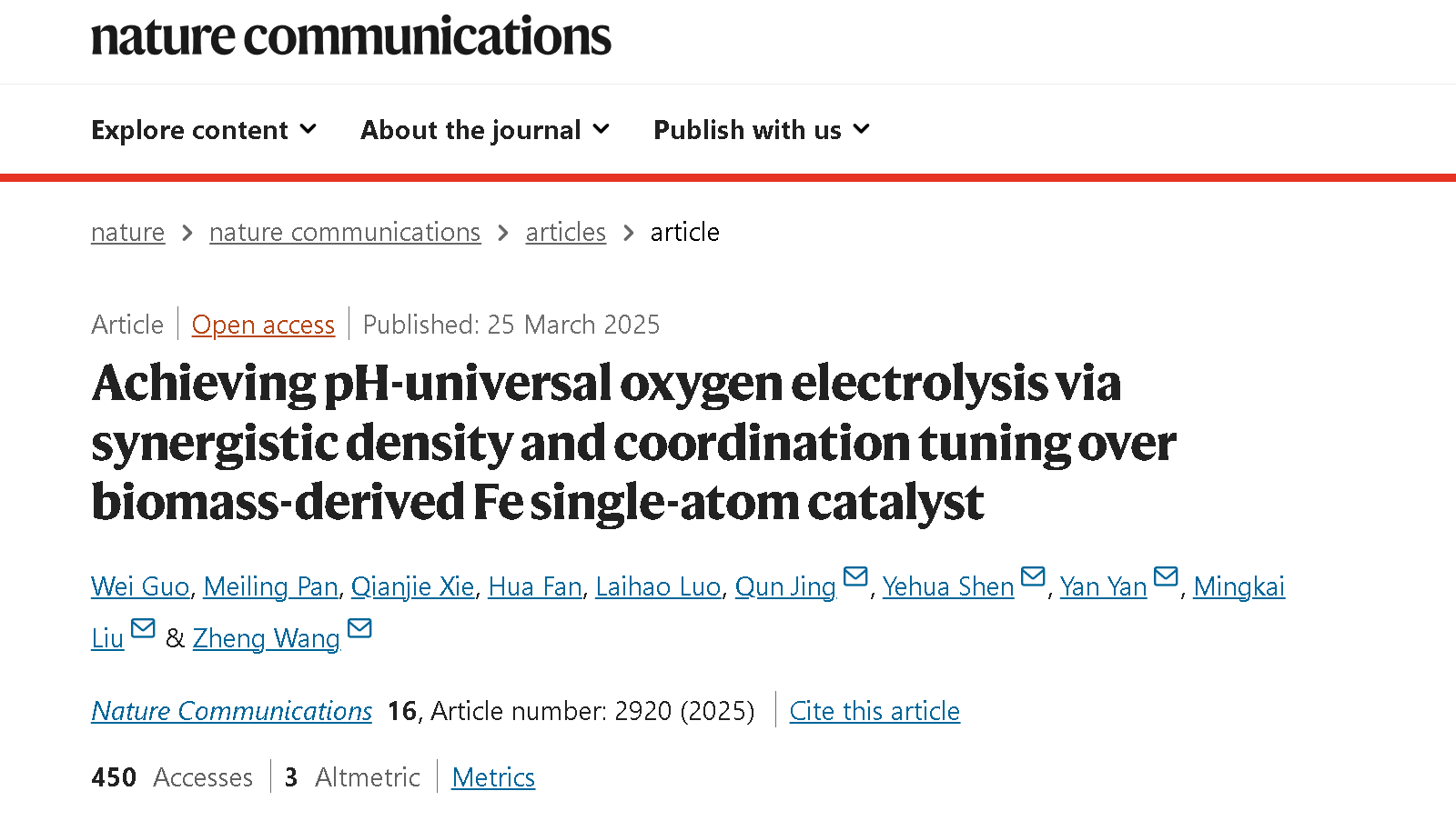 3月25日,英国威廉申烨华教授与新疆大学井群团队合作在Nature Communications期刊发表题为“Achieving pH-universal oxygen electrolysis via synergistic density and coordination tuning over biomass-derived Fe single-atom catalyst(生物质衍生铁单原子催化剂协同密度和配位调控以实现pH通用氧电解)”的研究论文,英国威廉集团官网Guo Wei、新疆大学Pan Meiling、陕西省医疗器械质量检验院Xie Qianjie为论文共同第一作者,井群、申烨华、安徽工业大学闫岩、安徽工业大学刘明凯、西安稀有金属材料研究院有限公司王正为论文共同通讯作者。